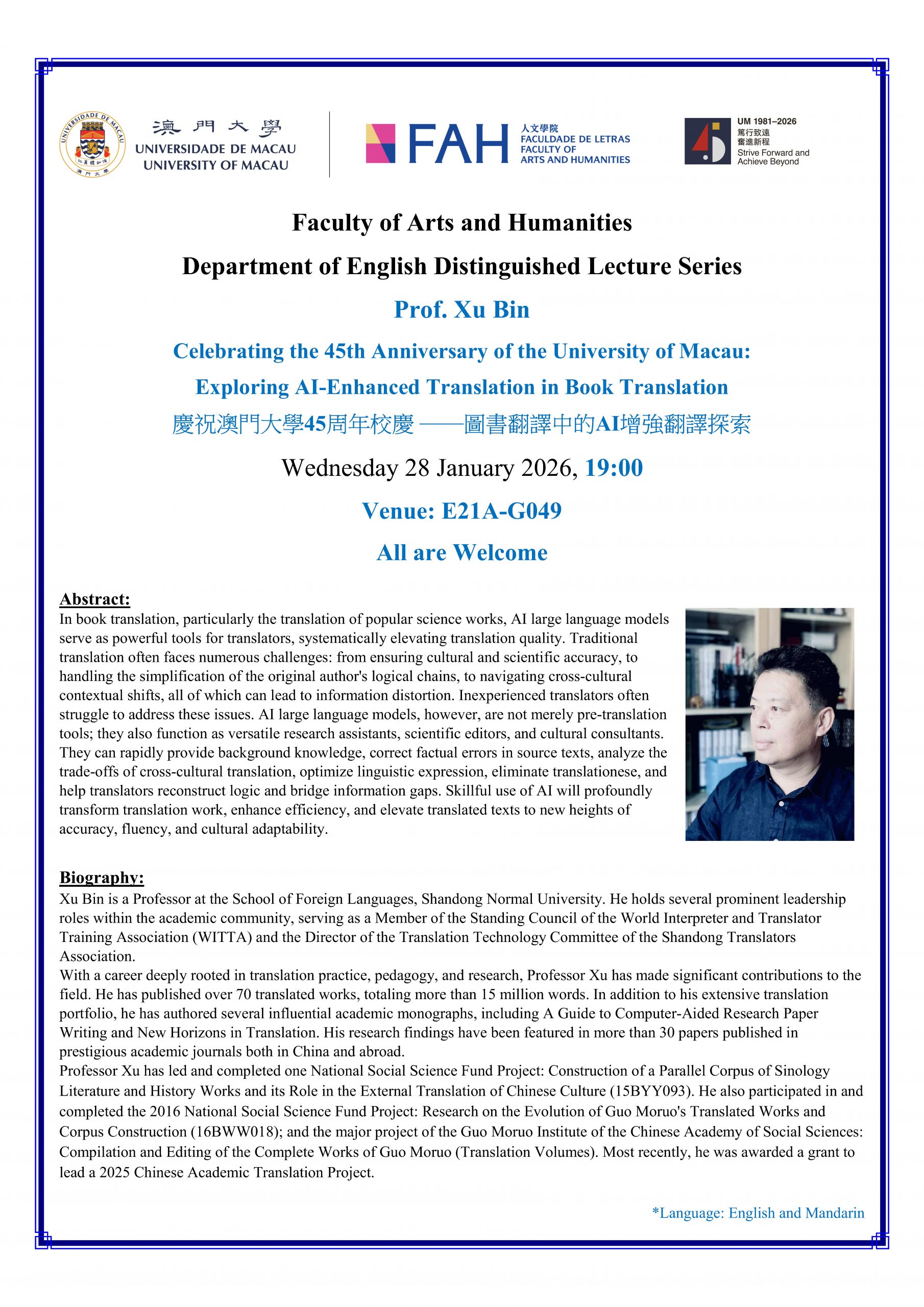 FAH – DENG Guest Lecture: “Exploring AI-Enhanced Translation in Book Translation”
