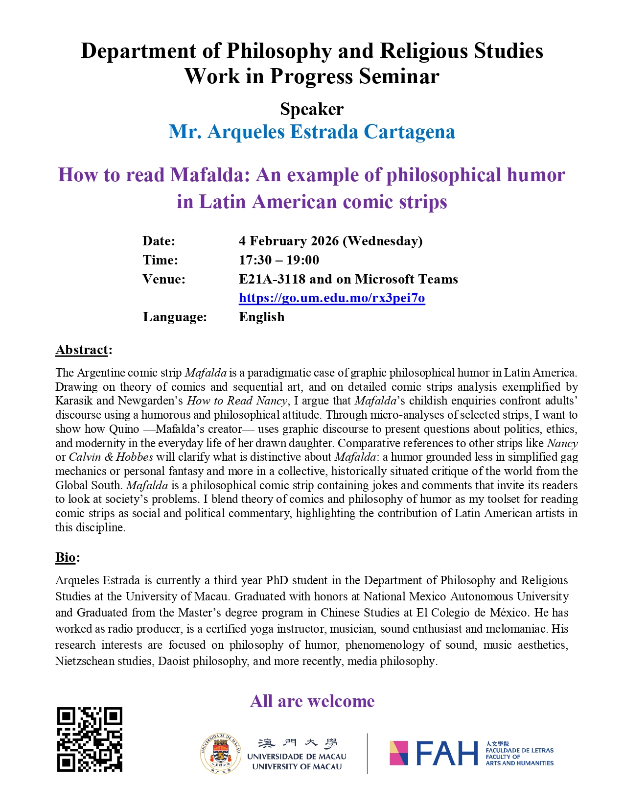 FAH/DPHIL Work-in-progress Seminar – “How to read Mafalda: An example of philosophical humor in Latin American comic strips” by Mr. Arqueles Estrada Cartagena