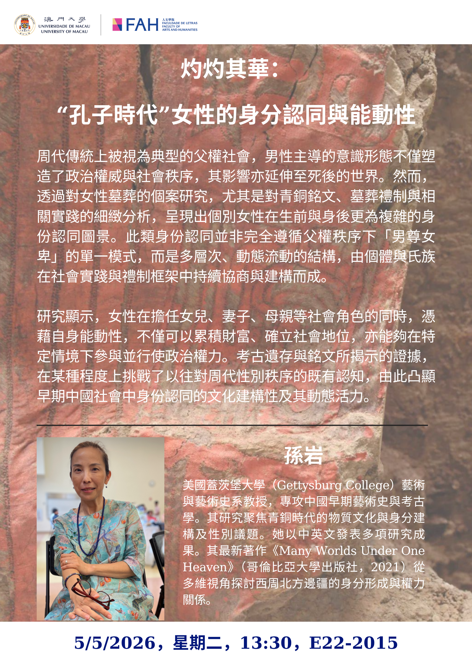 E34-G011活動名稱 : 人文學院藝術與設計系講座 : 內蒙古宗教建築遣產研究 類別 : 講座 / 演講, 活動, 學生活動 主辦單位 : 內蒙古工業大學,澳門大學 講者 : 王卓男 教授,李麗 教授,杜娟 副教授 日期 : 2026年4月30日 時間 ...