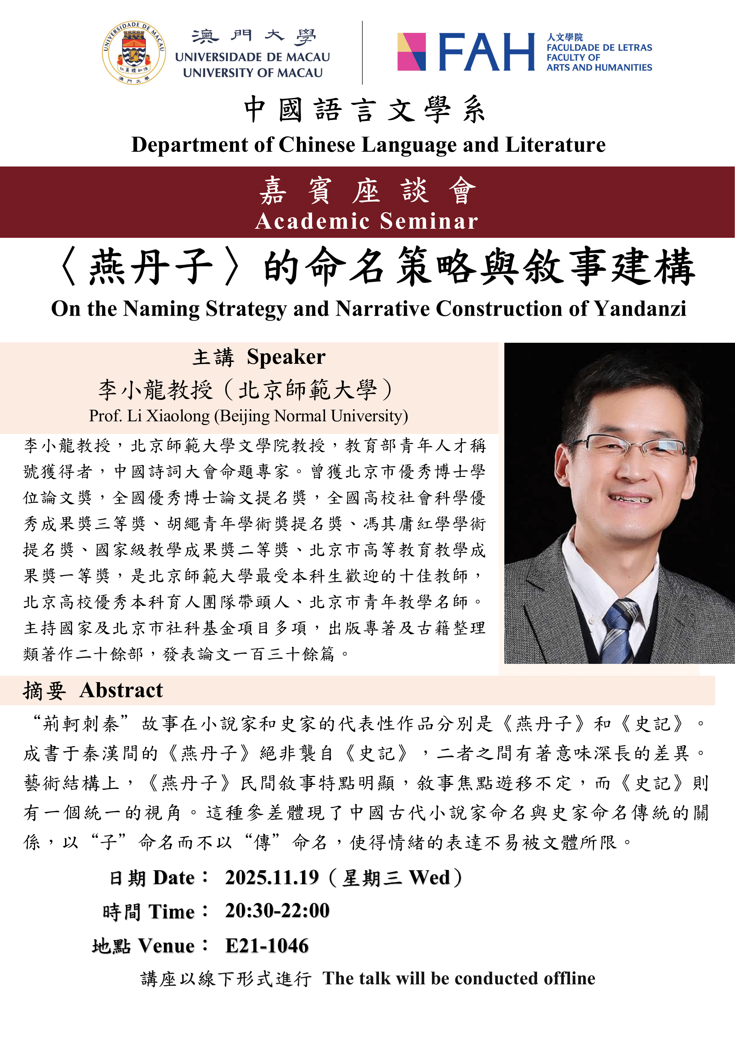 2025-11-19 @ 8:30 pm ~ 10:00 pm 人文學院中國語言文學系嘉賓講座: “〈燕丹子〉的命名策略與敘事建構” – 李小龍教授 FAH-DCLL Guest Lecture : “On the Naming Strategy and Narrative Construction of Yandanzi” by Prof. Li Xiaolong E21-1046 ...