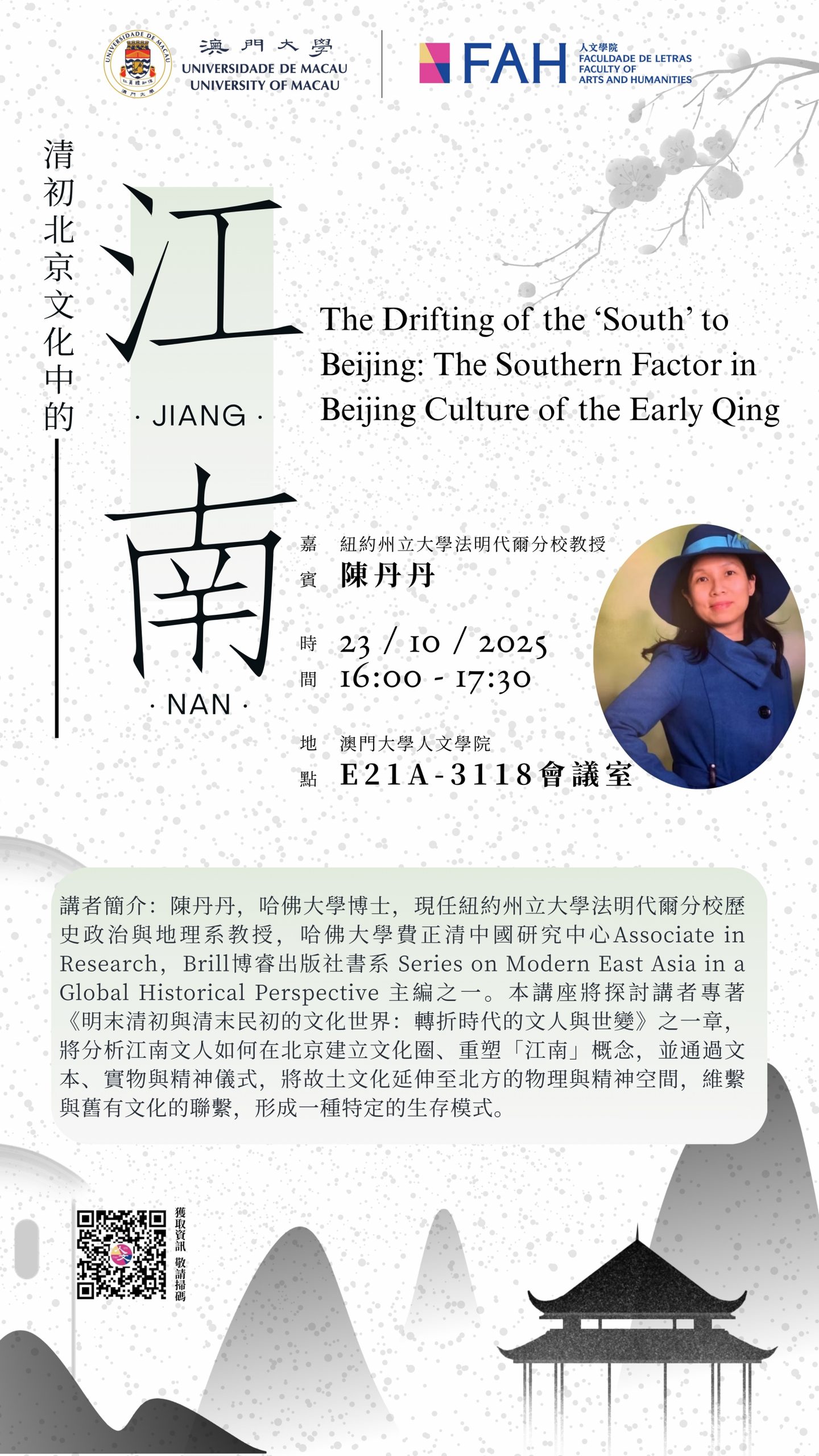 2025-10-23 @ 4:00 pm ~ 5:30 pm 人文學院中國語言文學系嘉賓講座: “清初北京文化中的“江南”” – 陳丹丹教授 FAH-DCLL Guest Lecture: “The Drifting of the ‘South’ to Beijing: The Southern Factor in Beijing Culture of the Early Qing” by Prof. Chen Dandan E21-3118 ...