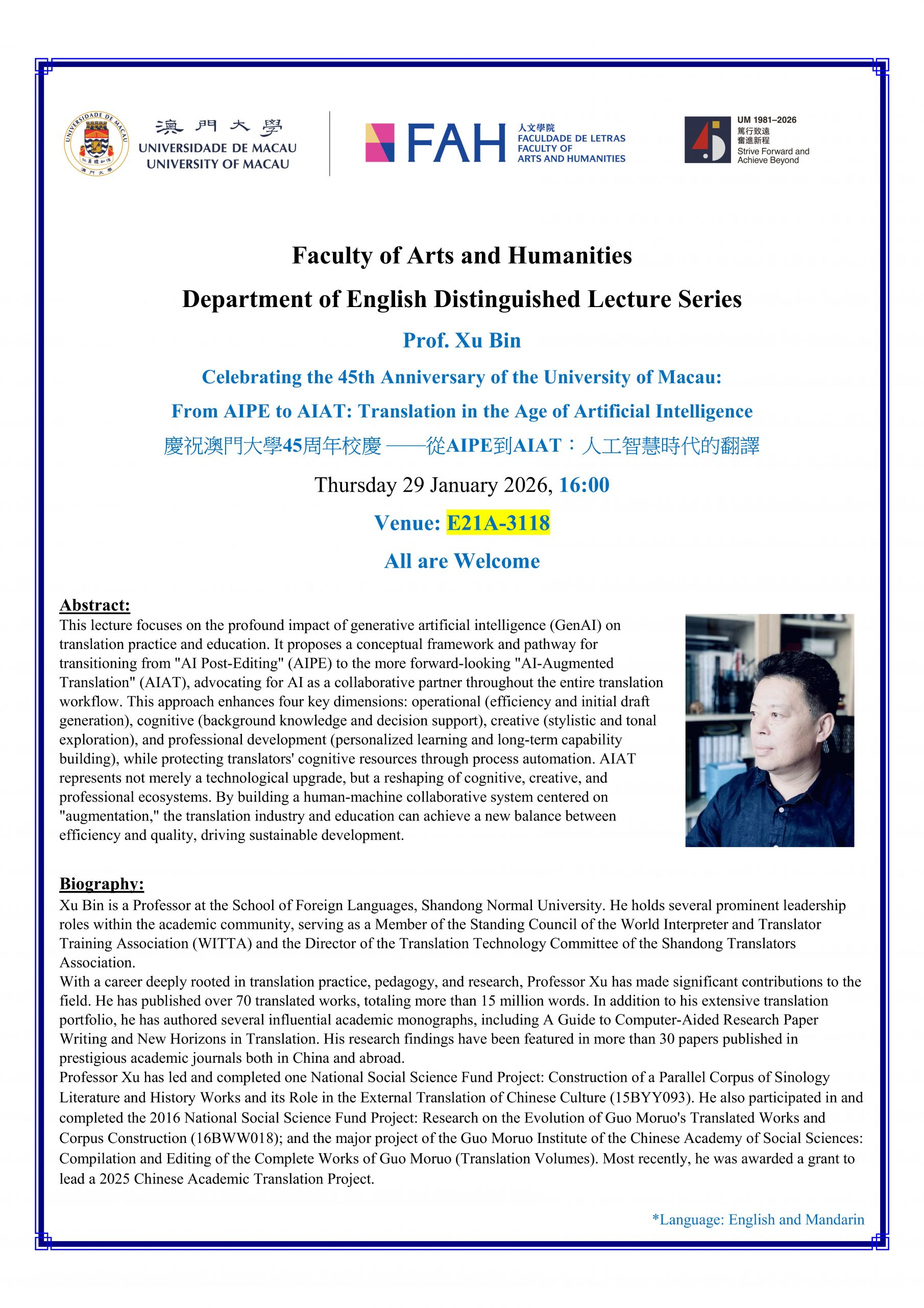 FAH-DENG Guest Lecture: “From AIPE to AIAT: Translation in the Age of Artificial Intelligence”