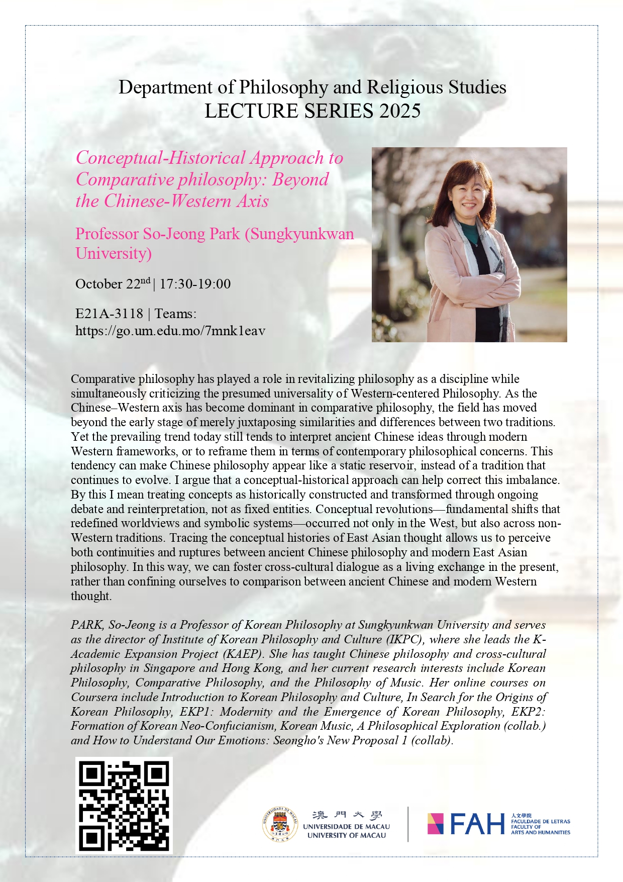 FAH/DPHIL Lecture Series – “Conceptual-Historical Approach to Comparative philosophy: Beyond the Chinese-Western Axis” by Prof. So-Jeong Park, Sungkyunkwan University, Korea