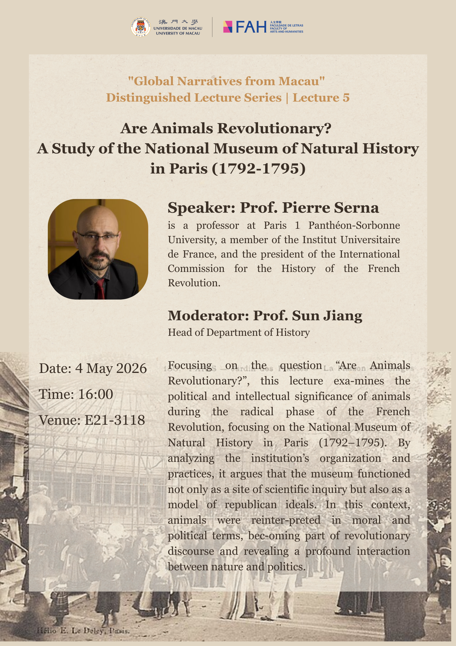 2026-05-04 @ 4:00 pm ~ 5:30 pm “Global Narratives from Macau” Distinguished Lecture Series | Lecture 5: Are Animals Revolutionary? A Study of the National Museum of Natural History in Paris (1792-1795) E21-3118 ...