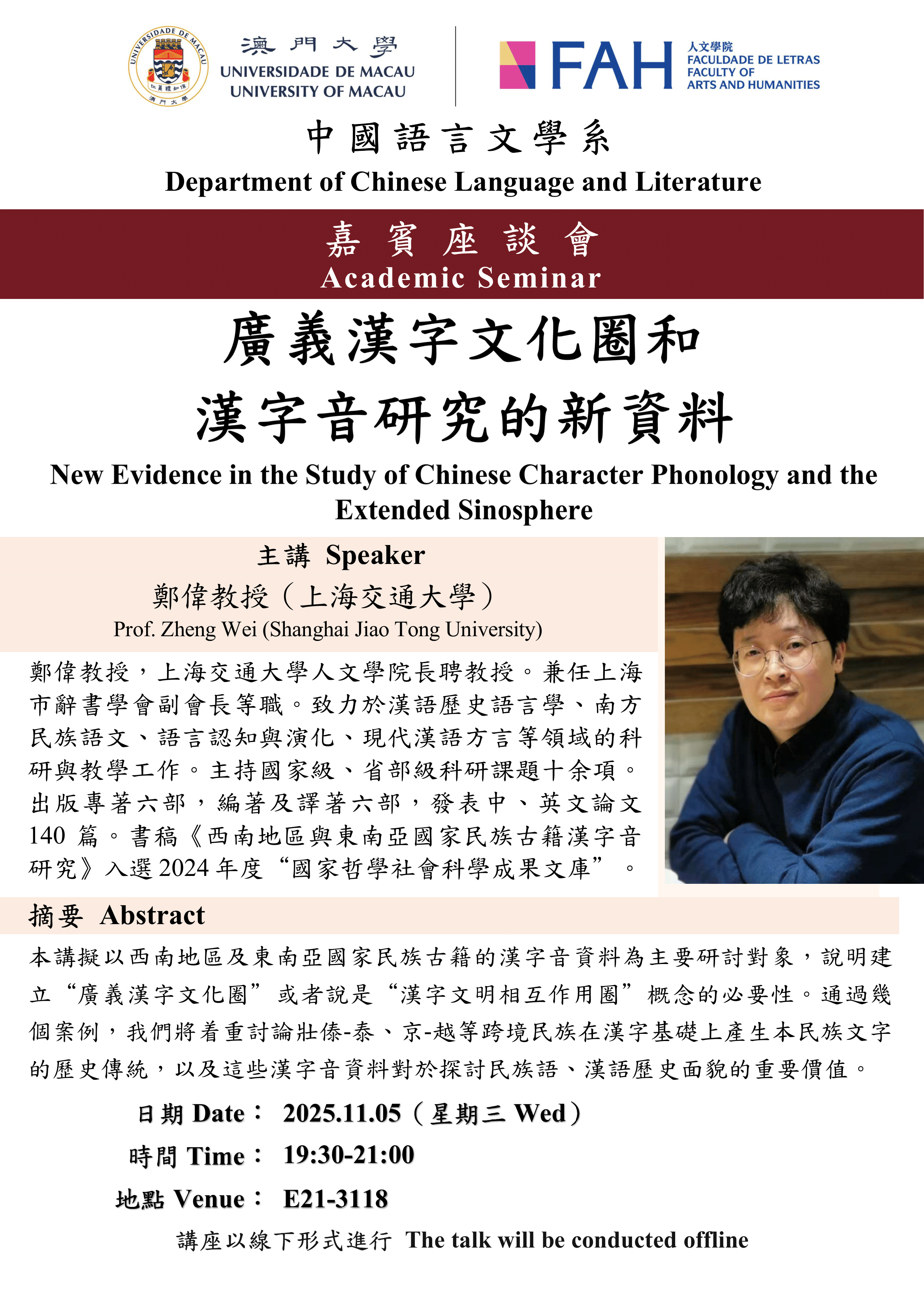E21B-G016鏡海人文論壇第22講(2025/2026學年第二講)將於2025年10月27日舉行。論壇定期邀請來自不同人文領域的世界知名學者,與學院師生分享其研究成果。我們誠摯邀請澳大同仁參加本次精彩的論壇。 在本次論壇中,我們十分榮幸邀請 ...