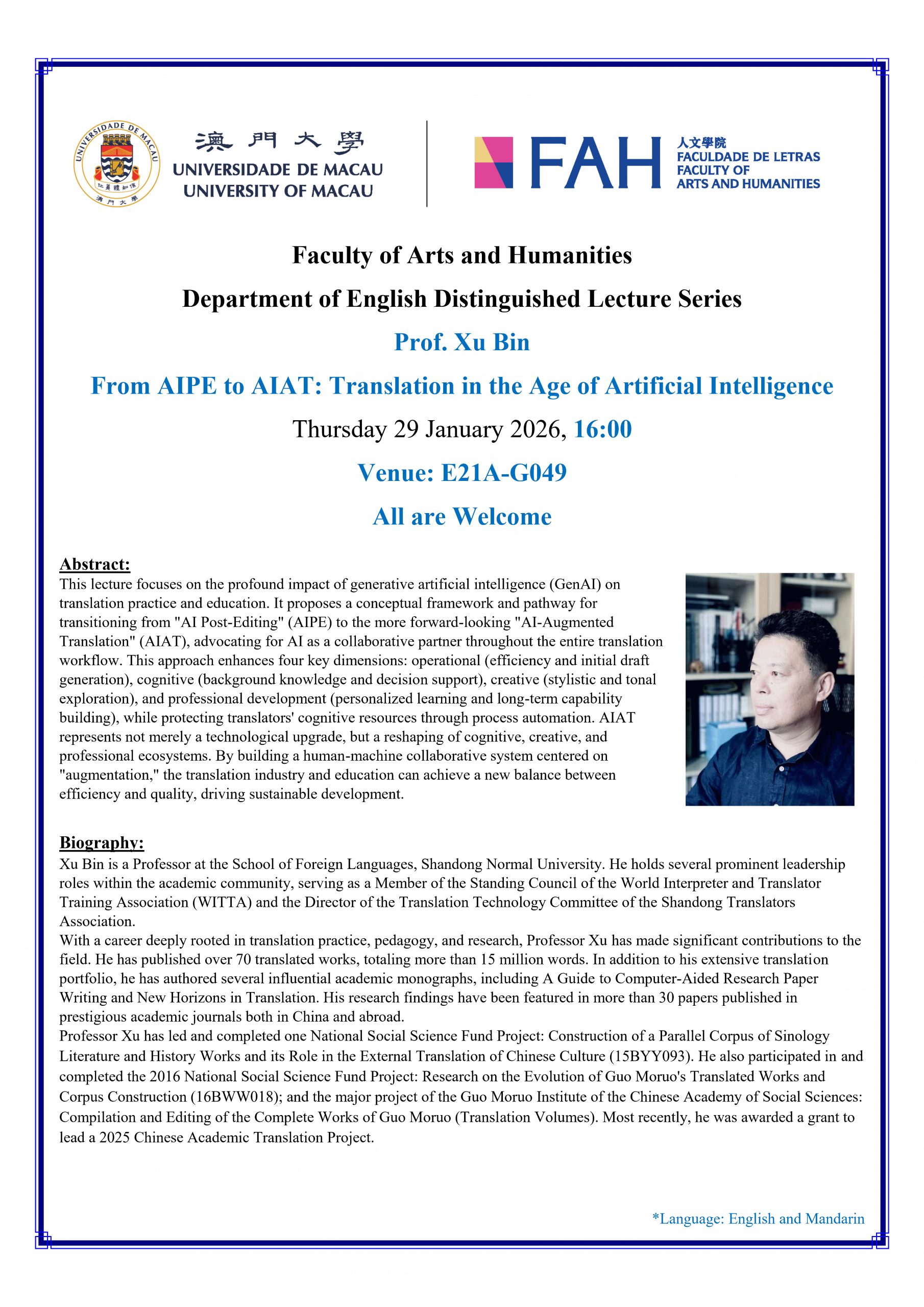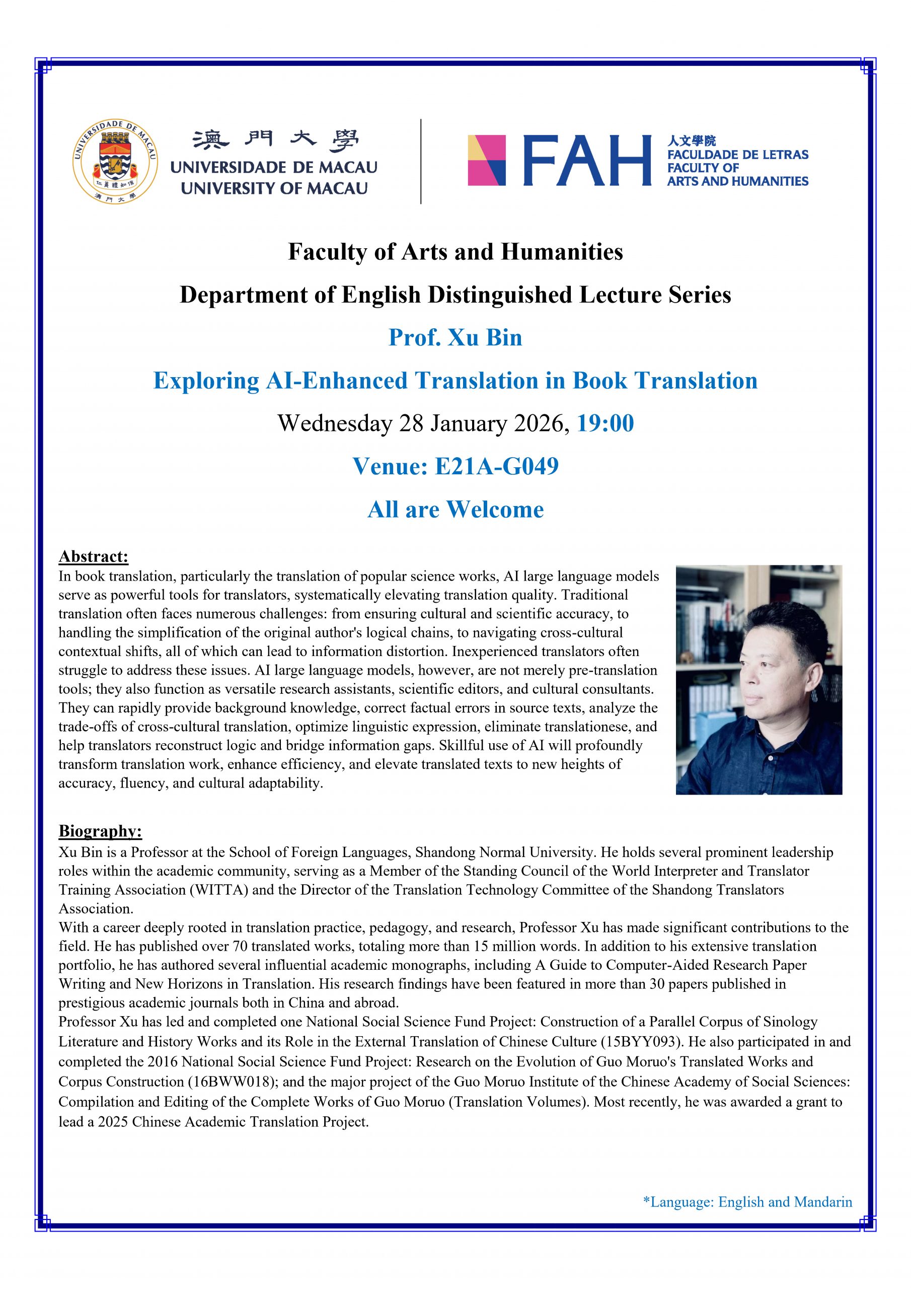 E21-G049We are delighted to invite you to the 3rd Lecture of the FAH Macao Humanities Forum (2025/2026) scheduled on 4 February ...