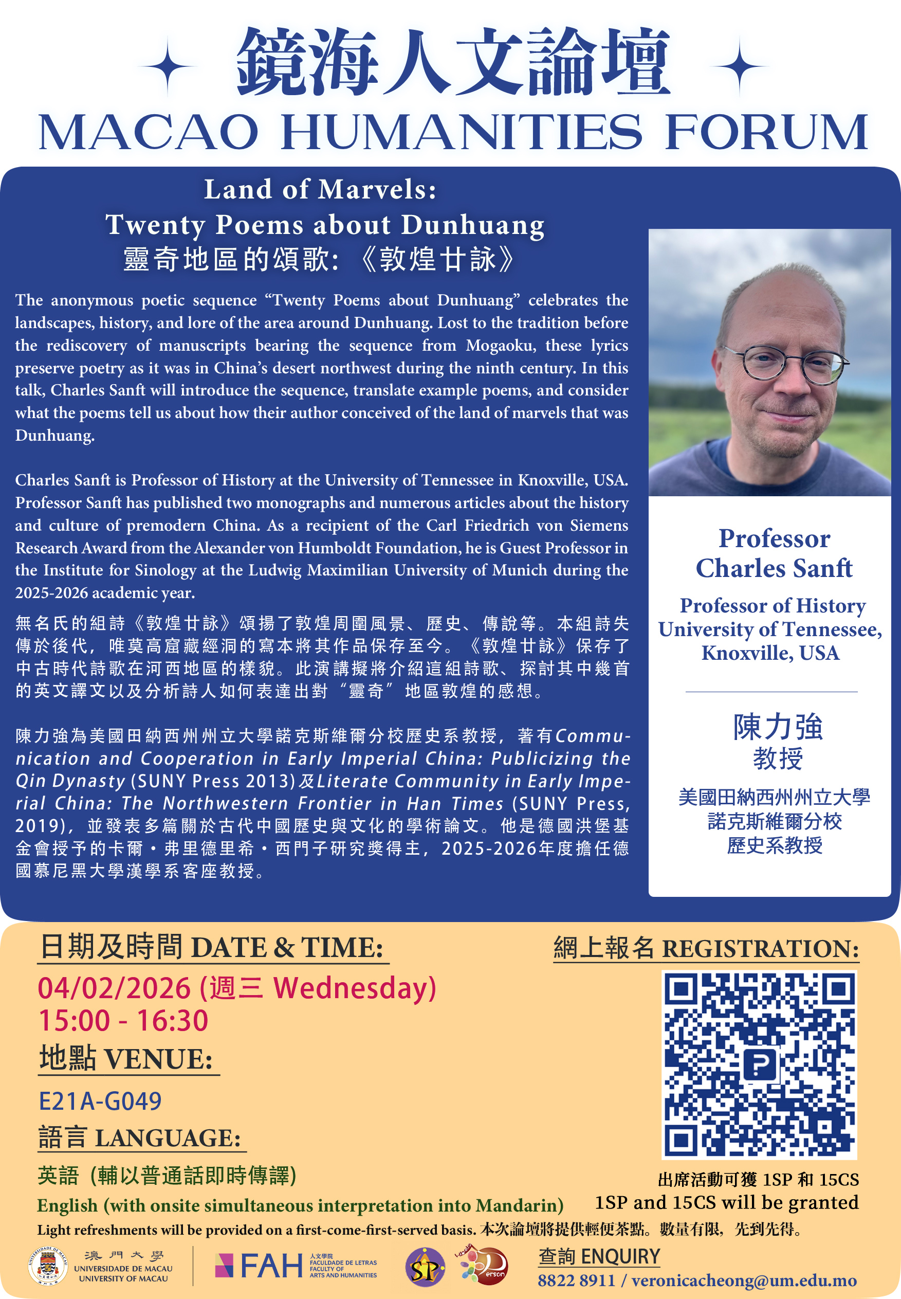 【Macao Humanities Forum】Land of Marvels: Twenty Poems about Dunhuang by Prof. Charles Sanft from University of Tennessee (1 Smart Point and 15 CS)