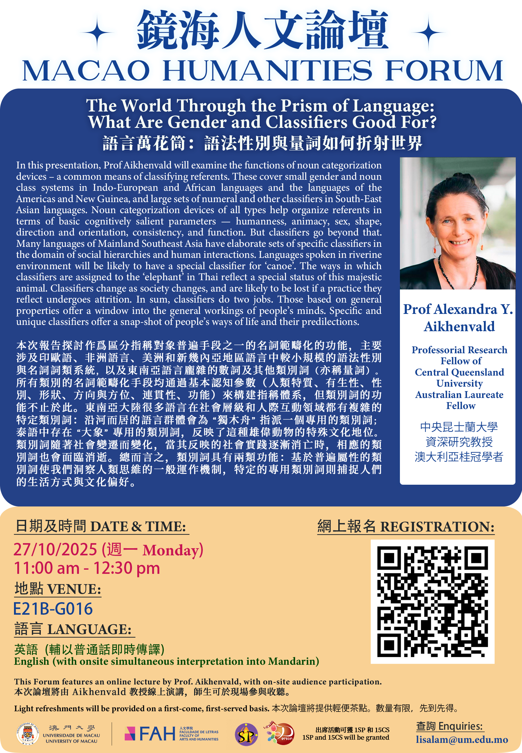 【鏡海人文論壇】語言萬花筒:語法性別與量詞如何折射世界 –中央昆士蘭大學 Alexandra Y. Aikhenvald 教授 (1粒至叻星及15個CS)