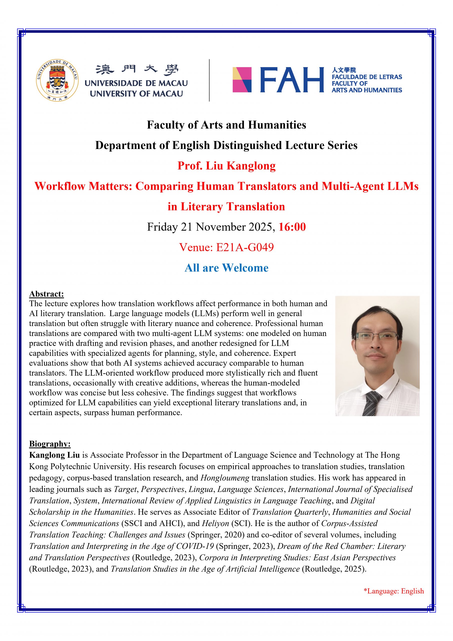 Abstract: The lecture explores how translation workflows affect performance in both human and AI literary translation. Large language models (LLMs) perform well in general translation but often struggle with literary nuance and coherence. Professional human translations are compared with two multi-agent LLM systems: one modeled on human practice with drafting and revision phases, and another redesigned for LLM capabilities with specialized agents for planning, style, and coherence. Expert evaluations show that both AI systems achieved accuracy comparable to human translators. The LLM-oriented workflow produced more stylistically rich and fluent translations, occasionally with creative additions, whereas the human-modeled workflow was concise but less cohesive. The findings suggest that workflows optimized for LLM capabilities can yield exceptional literary translations and, in certain […]