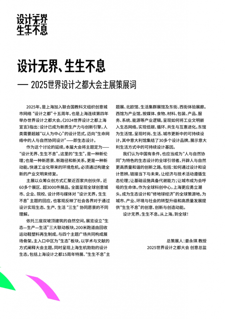 2025年是上海成為“設計之都”15周年,也是上海連續第4年舉辦世界設計之都大會。本屆大會以“設計無界,生生不息”為主題,持續踐行“構建全球設計創新合作平臺、探求設計驅動新質發展之路、推動城市和生活處處有設計”的使命願景。