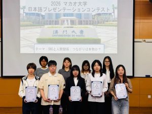 同日上午,澳門大學日文系主辦了「2026澳門大學日語創意演講比賽」,演講主題為「SNS與人際關係:連結是否真實?」。比賽由澳大日文系安藤美保老師主持,澳門大學日文系楊文江教授和暨南大學日語系李莉薇先後致辭。本次比賽兩校共派出9名本科生參賽,經過兩校教師的評審,最終結果如下:一等獎胡笛(暨南大學),二等獎羅雨婷(暨南大學),三等獎何卓亨(澳門大學),特別獎由澳門大學王臨珠和楊涵獲得。參加評審的澳門大學木村久美子老師在賽後表示,本次比賽充分展現了兩校學生在日語表達、思辨能力與臨場應對方面的學習成果,參賽學生圍繞同一主題,從不同視角展開演講,內容充實且富有啟發性,整體水準很高。獲得第一名與第二名的學生在日語發音、話語節奏及目光運用等方面表現尤為突出,展示了她們充分準備與反覆練習的成果。木村老師亦指出,這場比賽對於澳大日文系的學生是一次很好的刺激與學習機會,整體而言是一場非常精彩的演講比賽。